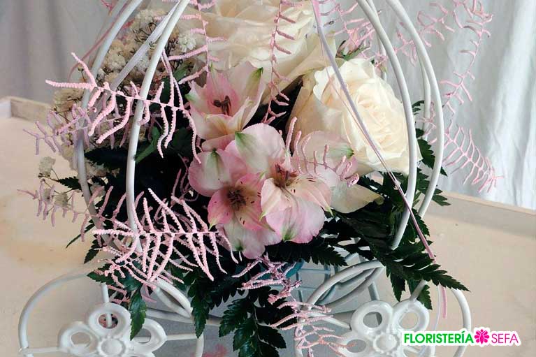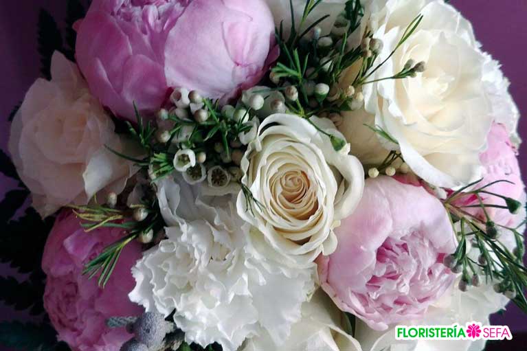 Además de los variados detalles y complementos de estilo vintage que componen cada ambiente cabe destacar la composición del ramo de novia realizada por una combinación de Peonias rosa, rosas blancas y un toque de flor de cera.