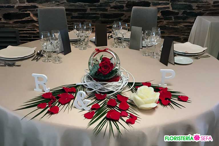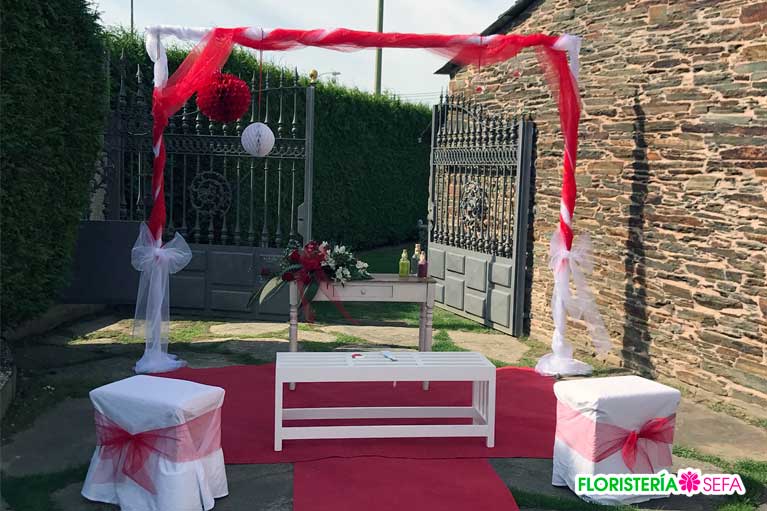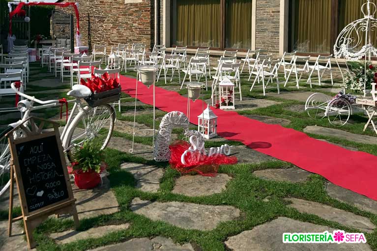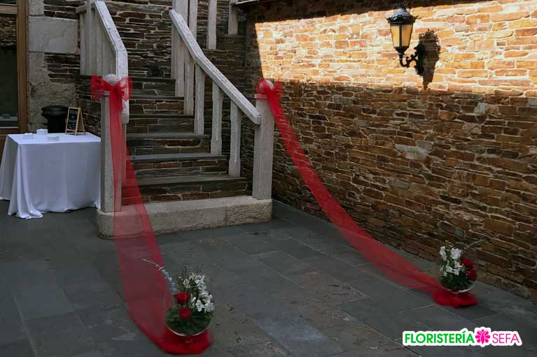 La decoración fue realizada tanto en los exteriores donde tubo lugar la celebración del enlace como en el interior para adornar las mesas del banquete nupcial.
