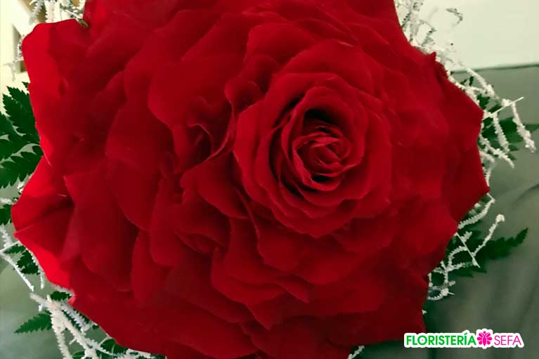 Cabe destacar que el ramo de la novia está realizado con Rosmelia Roja creando una elaborada composición pétalo a pétalo para recrear la apariencia de una única flor.
